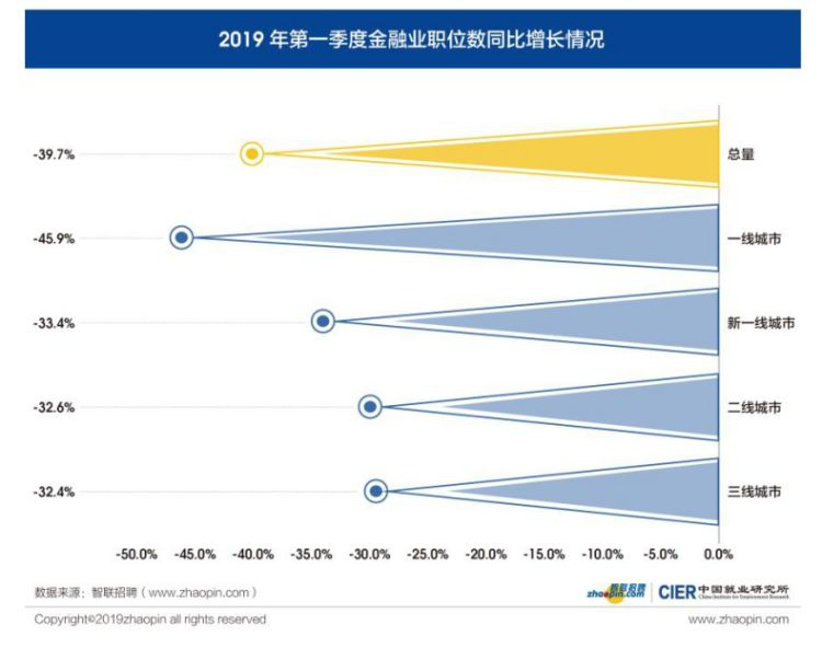 此外,調(diào)研顯示,備受矚目且高薪的金融行業(yè)本季度就業(yè)狀況并未隨著股市的回暖同步好轉(zhuǎn)。根據(jù)智聯(lián)招聘大數(shù)據(jù),金融業(yè)2019年一季度的招聘職位數(shù)降幅在所有行業(yè)中最高,達(dá)39.7%。其中一線城市金融行業(yè)職位數(shù)的降幅最大,為45.9%,新一線、二線和三線城市的降幅均在33%左右。2017年以來,強(qiáng)化監(jiān)管成為金融領(lǐng)域的主基調(diào),在去杠桿、防風(fēng)險(xiǎn)的同時(shí),金融行業(yè)發(fā)展速度有所放緩,向市場(chǎng)提供的就業(yè)機(jī)會(huì)也整體下降,這在互聯(lián)網(wǎng)金融等新興業(yè)態(tài)主要活躍的一線城市表現(xiàn)更為明顯。