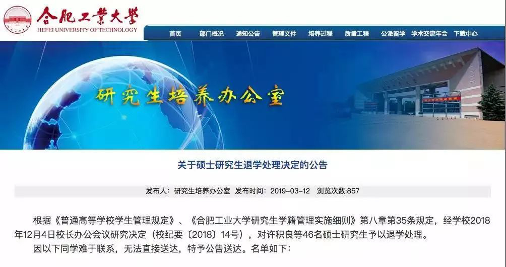 對(duì)46名碩士研究生予以退學(xué)處理,因其在學(xué)校規(guī)定的最長學(xué)習(xí)年限內(nèi)未完成學(xué)業(yè),或超過學(xué)校規(guī)定期限未注冊而又無正當(dāng)理由,且未經(jīng)請(qǐng)假離校連續(xù)兩周未參加學(xué)校的教學(xué)活動(dòng)。
