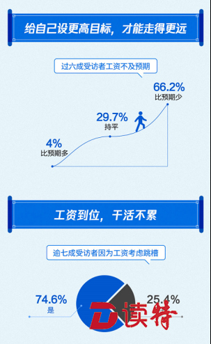 報告顯示,受經(jīng)濟環(huán)境等因素影響,過六成受訪者工資不及預(yù)期,同時,工資水平影響了職場人的職業(yè)規(guī)劃,逾七成受訪者因為工資考慮跳槽;66.2%的受訪者工資水平比預(yù)期少,只有4%的受訪者認為工資比預(yù)期多,此外,逾七成受訪者認為工資是考慮跳槽的主要因素。