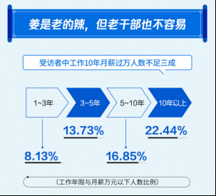 此外,受訪者月薪過萬人數(shù)與隨著工作年限遞增,但工作10年月薪高于1萬的人數(shù)依然不足三成。報告顯示,工作10年以上的受訪者中月薪過萬人數(shù)比例為22.44%、工作5-10年月薪過萬人數(shù)比例為16.85%、工作3-5年月薪過萬人數(shù)比例為13.73%、而工作1-3年月薪過萬人數(shù)比例是8.13%。這也從側(cè)面說明了工作經(jīng)驗不是影響工資水平的唯一因素,想要得到高薪,經(jīng)濟環(huán)境、工作地域、從事行業(yè)等因素也至關(guān)重要。