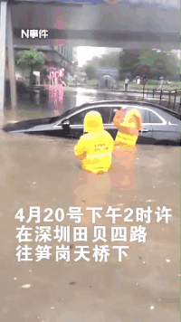 連日暴雨襲城,4月20日下午2時(shí)許,一深圳市民開車行駛到田貝四路往筍崗天橋下時(shí),車已經(jīng)有大半被水浸沒。