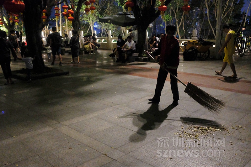 21時,燈光秀結(jié)束后,蓮花山公園山頂廣場打掃衛(wèi)生的環(huán)衛(wèi)工(楊浩翰 攝)