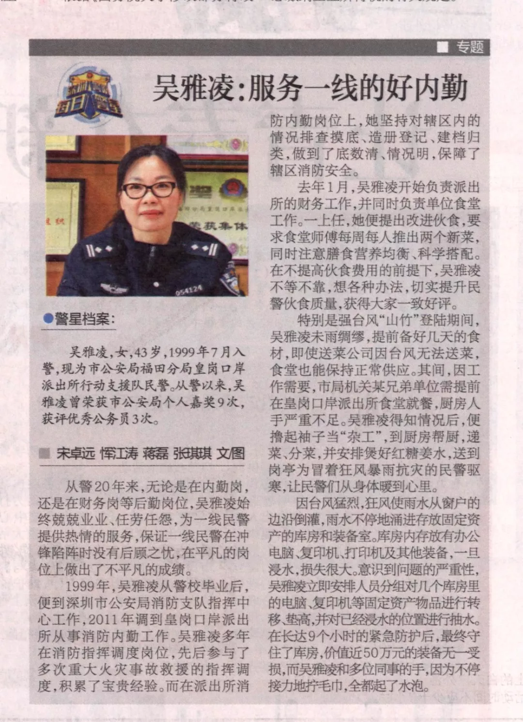 1999年,吳雅凌從警校畢業(yè)后,便到深圳市公安局消防支隊(duì)指揮中心工作,2011年調(diào)到皇崗口岸派出所從事消防內(nèi)勤工作。吳雅凌多年駐扎在消防指揮調(diào)度崗位,先后參與了多次重大火災(zāi)事故救援的指揮調(diào)度,積累了寶貴經(jīng)驗(yàn)。而在派出所消防內(nèi)勤崗位上,她堅(jiān)持對(duì)轄區(qū)內(nèi)的情況排查摸底、造冊登記、建檔歸類,做到了底數(shù)清、情況明,保障了轄區(qū)消防安全。