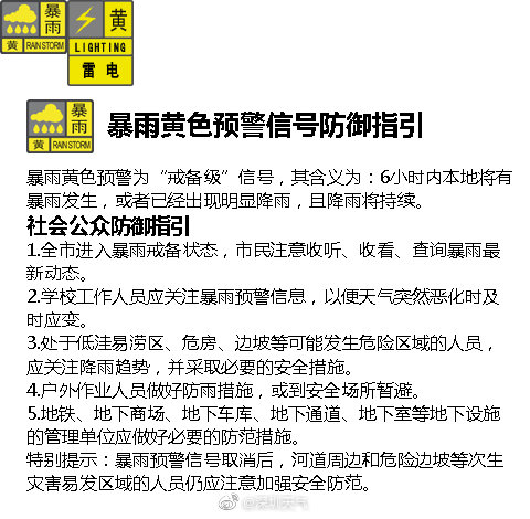 市民注意收聽(tīng)、收看、查詢暴雨最新動(dòng)態(tài)。學(xué)校工作人員應(yīng)關(guān)注暴雨預(yù)警信息,以便天氣突然惡化時(shí)及時(shí)應(yīng)變。處于低洼易澇區(qū)、危房、邊坡等可能發(fā)生危險(xiǎn)區(qū)域的人員,應(yīng)關(guān)注降雨趨勢(shì),并采取必要的安全措施。戶外作業(yè)人員做好防雨措施,或到安全場(chǎng)所暫避。5.地鐵、地下商場(chǎng)、地下車庫(kù)、地下通道、地下室等地下設(shè)施的管理單位應(yīng)做好必要的防范措施。特別提示:暴雨預(yù)警信號(hào)取消后,河道周邊和危險(xiǎn)邊坡等次生災(zāi)害易發(fā)區(qū)域的人員仍應(yīng)注意加強(qiáng)安全防范。