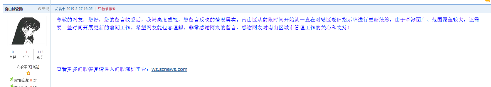 為及時解決網(wǎng)友疑問,5月27日下午,南山城管局在網(wǎng)友“syh19667288”發(fā)布的帖文下給予回復稱需要時間來開展更新工作。具體回復如下: