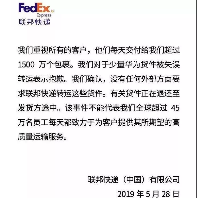 聯(lián)邦快遞(中國)公司28日在其社交媒體官方賬號稱,“我們對于少量華為貨件被失誤轉運表示抱歉。我們確認,沒有任何外部方面要求聯(lián)邦快遞轉運這些貨件。有關貨件正在退還至發(fā)貨方途中?!?/p>