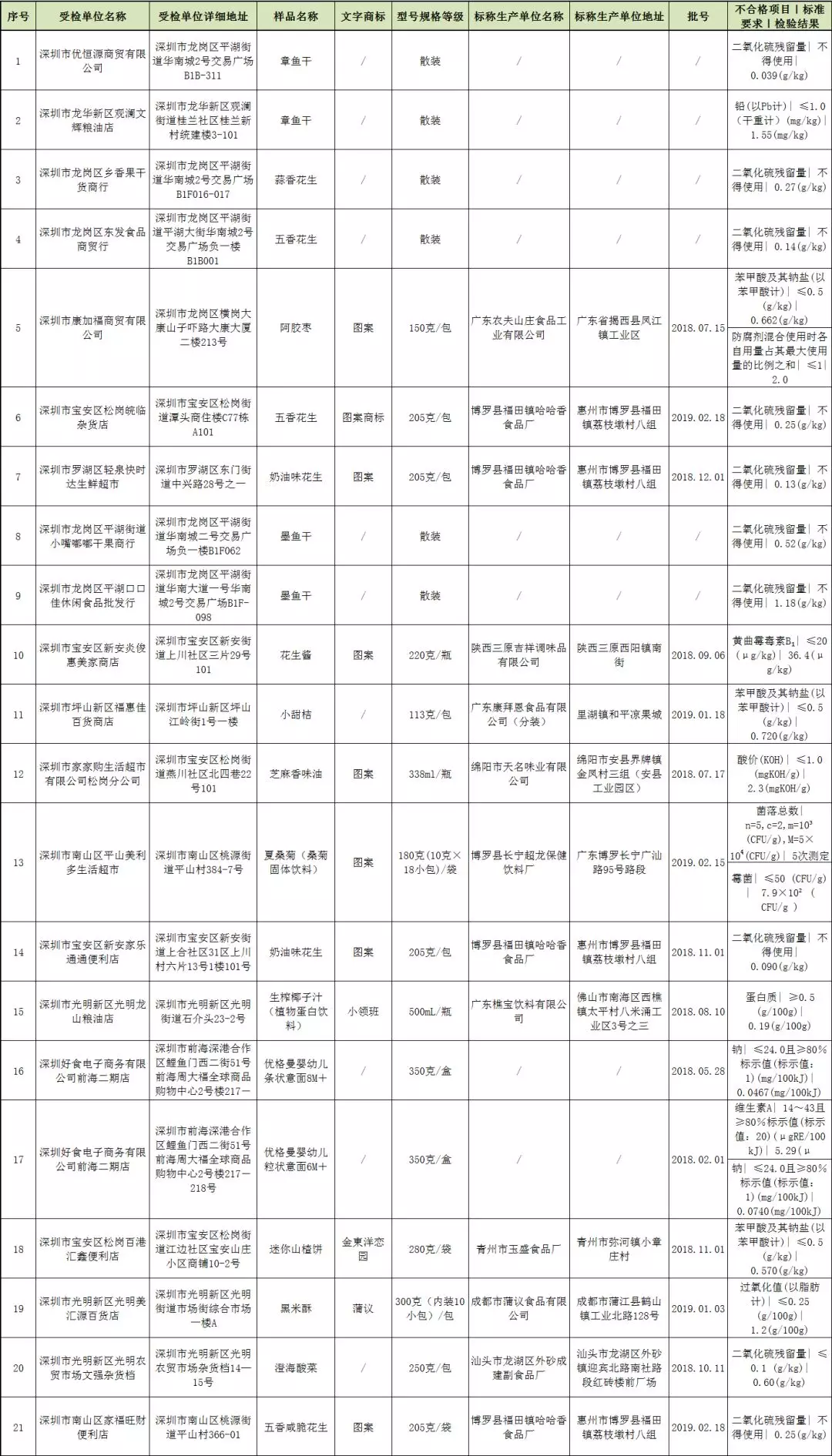 本次共抽檢流通環(huán)節(jié)食品2455批次,涉及流通環(huán)節(jié)經(jīng)營主體870家次,共檢測食品指標(biāo)14705項(xiàng)次。其中檢出不合格樣品21批次,涉及不合格食品類別有炒貨食品及堅(jiān)果制品6批次,食用油、油脂及其制品1批次,蔬菜制品1批次,薯類和膨化食品1批次,水產(chǎn)制品4批次,水果制品3批次,特殊膳食食品2批次,調(diào)味品1批次,飲料2批次;涉及不合格項(xiàng)目類別為金屬等元素污染、微生物污染、食品添加劑、品質(zhì)指標(biāo)、生物毒素污染。