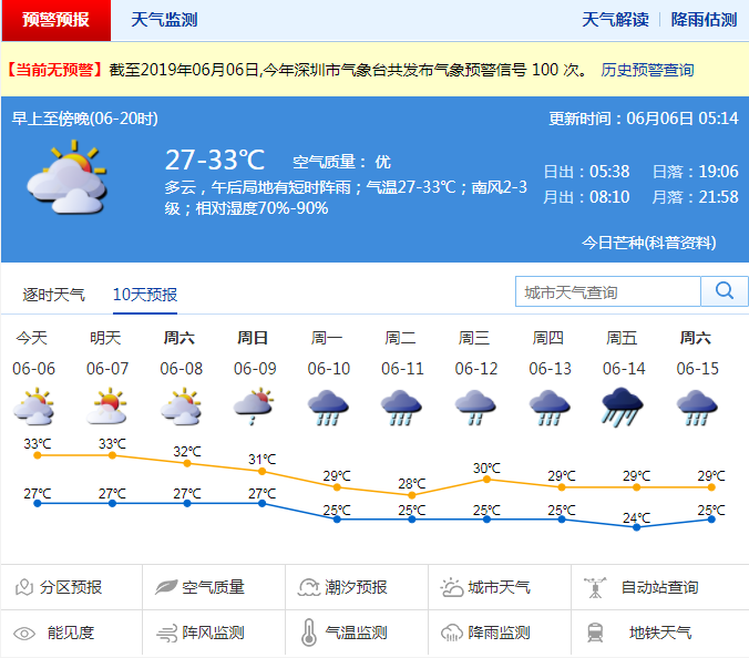深圳新聞網(wǎng)2019年6月6日訊 今天白天,全市多云,午后局地有短時(shí)陣雨;氣溫27-33℃;南風(fēng)2-3級;相對濕度70%-90%。天氣炎熱,市民外出請注意防暑降溫,參加戶外活動(dòng)時(shí)需及時(shí)補(bǔ)充水分。