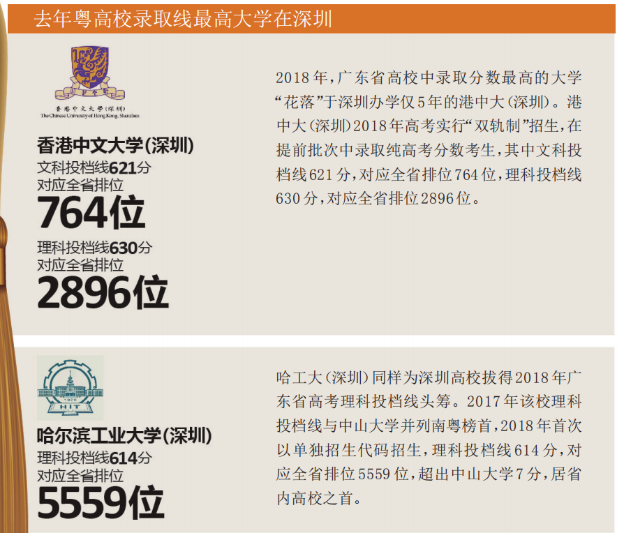 哈工大(深圳)同樣為深圳高校拔得2018年廣東省高考理科投檔線頭籌。2017年該校理科投檔線與中山大學并列南粵榜首,2018年首次以單獨招生代碼招生,理科投檔線614分,對應全省排位5559位,超出中山大學7分,居省內高校之首。