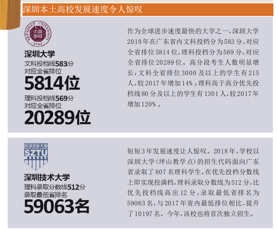 需要特別指出的是,去年廣東省合并一二本批次,在本科批次錄取時,率先錄取高分優(yōu)先投檔線(簡稱“高優(yōu)線”)上的考生。根據(jù)最終數(shù)據(jù)顯示,深圳6所本科高校投檔線全部在高優(yōu)線以上。