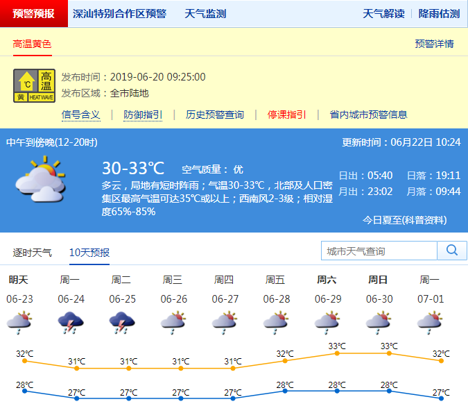 深圳新聞網(wǎng)2019年6月22日訊 受副熱帶高壓的影響,近幾日深圳氣溫持續(xù)上升,昨日(夏至)白天最高氣溫32℃~34℃,中北部及人口密集區(qū)最高氣溫達(dá)到35℃以上,全市高溫黃色預(yù)警生效中。周末恰逢中考到來(lái)(6月22日至24日),預(yù)計(jì)22日天氣炎熱到酷熱,中北部及人口密集區(qū)最高氣溫可達(dá)35℃或以上,提醒考生家長(zhǎng)出門(mén)做好防暑降溫措施。