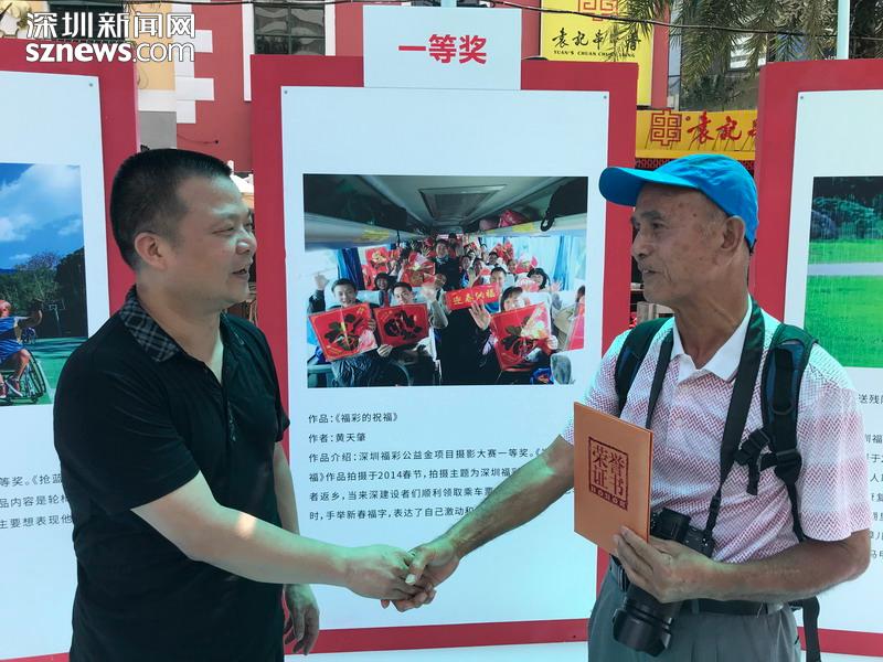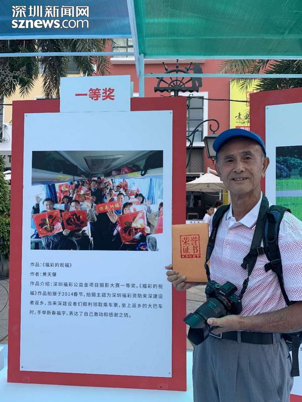 “我從報(bào)紙上看見深圳福彩舉辦的返鄉(xiāng)活動(dòng),覺得這個(gè)做公益獻(xiàn)愛心的活動(dòng)讓我很感動(dòng)。我想通過我的照片來彰顯深圳是一個(gè)大愛的城市,來讓大家看到深圳福彩的愛心宗旨?!?2歲的黃天肇憑借《福彩的祝福》作品榮獲本次大賽一等獎(jiǎng)。作為資深的攝影愛好者,他從深圳福彩舉辦“愛心福彩資助來深建設(shè)者春節(jié)返鄉(xiāng)”活動(dòng)開始,用相機(jī)記錄了十余年,“那個(gè)時(shí)候我都是用的傻瓜相機(jī)拍,獲獎(jiǎng)的作品就是我用傻瓜相機(jī)拍的,直到這兩年才開始用數(shù)碼相機(jī)。”對(duì)于此次展覽,黃天肇認(rèn)為深圳福彩組織選出的98張照片,承載著深圳對(duì)孤寡老人、弱勢(shì)群體、特困戶的關(guān)心,彰顯了深圳人的大愛,也激發(fā)市民通過購彩的方式奉獻(xiàn)愛心,他表示會(huì)一直用照片銘記這些珍貴的記憶。