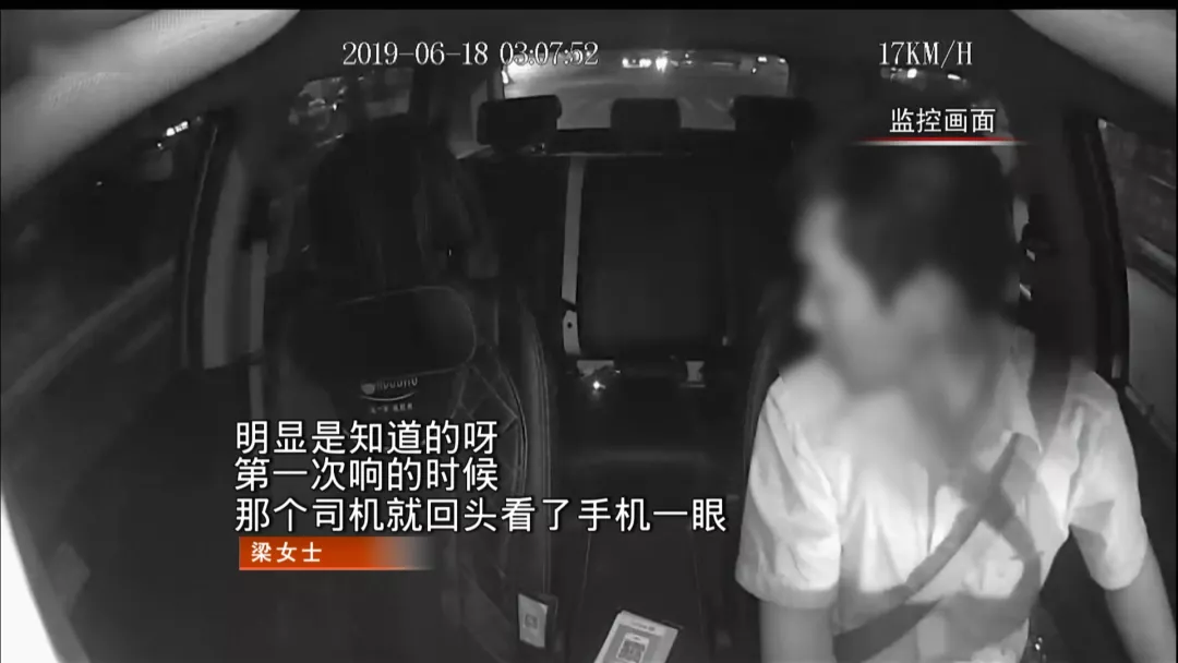 梁女士說,司機調(diào)大車內(nèi)聲音后,手機鈴聲還一直在響,閃光燈也一直在閃。在這期間士司機仍然有回頭查看的舉動。3點09分,的士司機靠邊停了車,監(jiān)控顯示他在打電話。15分鐘后,一名男性乘客上了車。