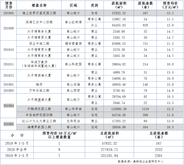 深圳預(yù)售均價(jià)10萬元/㎡以上的樓盤(2018.1-2019.5)