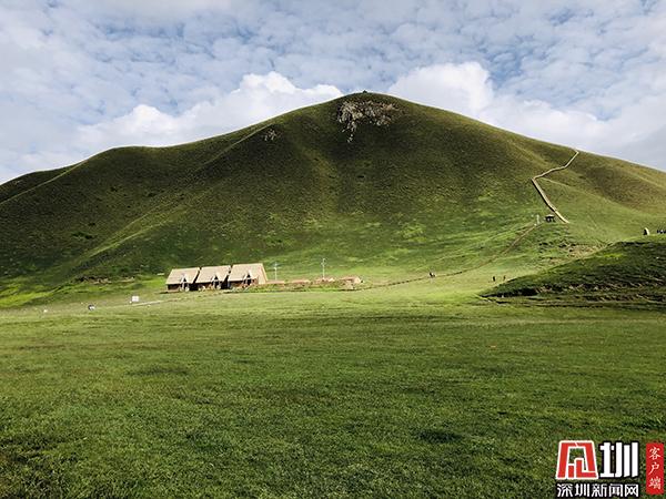 次日早上起來,見昆侖雪山近在咫尺,陽光照射在雪山頂上,倍感圣潔耀眼。雪山下面是綠綠的草原,草原上羊兒成群,馬兒四處奔跑,加上白色的蒙古包點(diǎn)綴其中,風(fēng)景十分迷人。身在草原上周身舒暢,心情自然也明朗起來。一條木制棧道沿山而上,像條長龍盤旋在山上,登高望遠(yuǎn),風(fēng)景如畫。