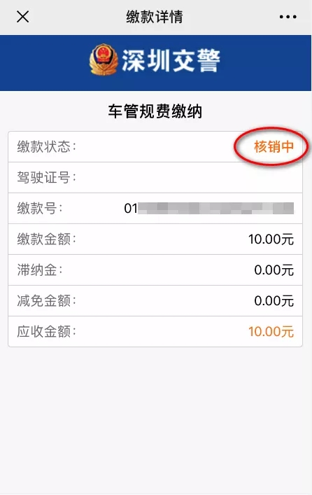 03 提交繳費(fèi)后,核對繳款號(hào)(前面會(huì)多01),應(yīng)收金額為10元。繳費(fèi)后再次查詢該流水,狀態(tài)為“核銷中”(即繳費(fèi)成功)。