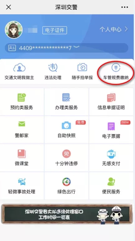 01 車主本人/代辦人關(guān)注【深圳交警】微信公眾號(hào),點(diǎn)擊進(jìn)入【星級(jí)用戶】,注冊登錄星級(jí)用戶后,在頁面選擇【車管規(guī)費(fèi)繳納】。
