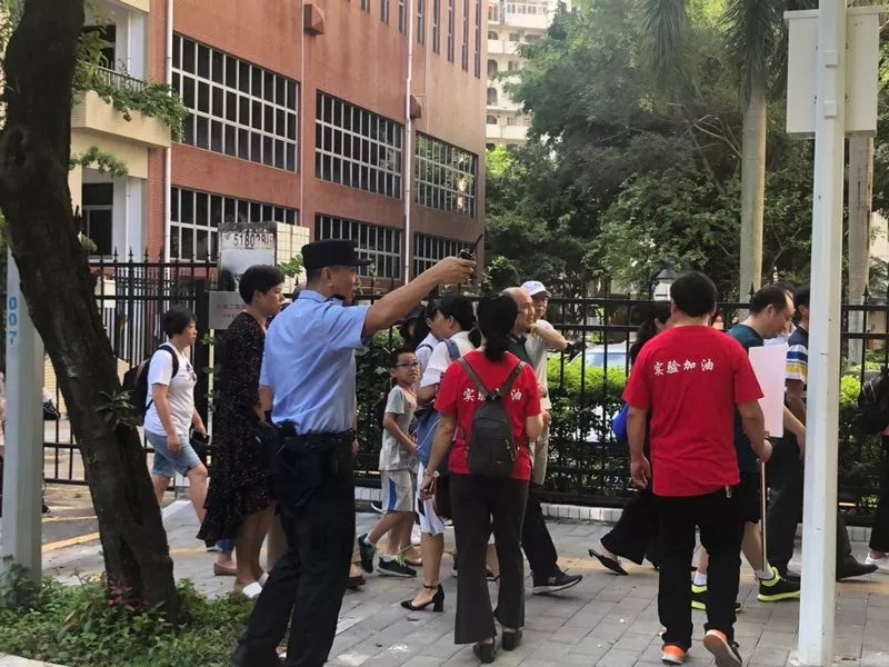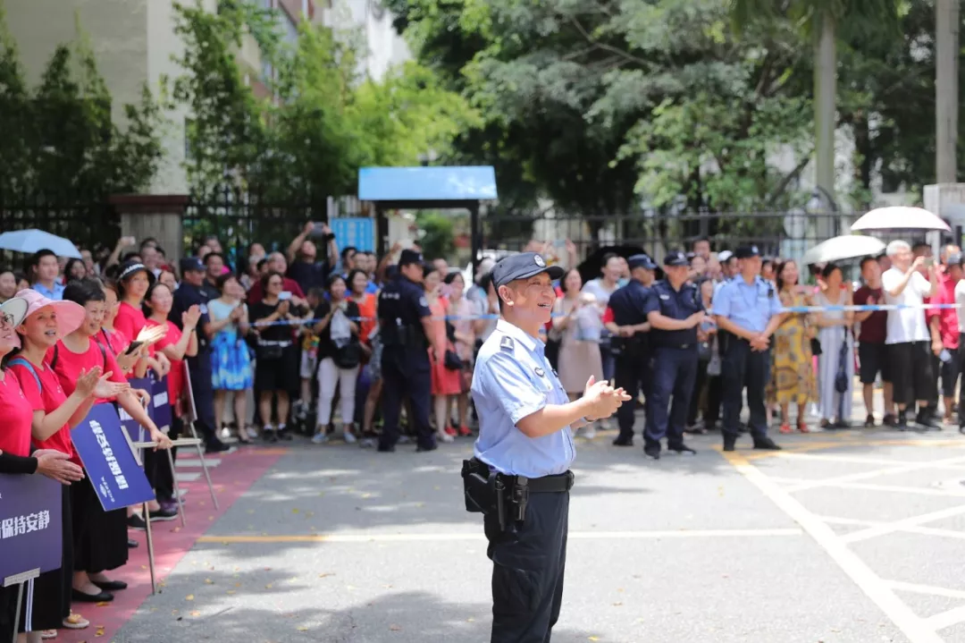 在深圳實驗中學(xué)的校門外,正在執(zhí)勤護(hù)考的通心嶺派出所所長林志強(qiáng)正跟送考的家長們“嘮嗑”。“大家都站這么久了,辛苦了!一會考試結(jié)束后,咱們來猜一猜第一個走出來的是男生還是女生?!薄拔也率悄猩!薄拔也率桥??!奔议L們一掃臉上焦急的表情,開始笑著討論起來。