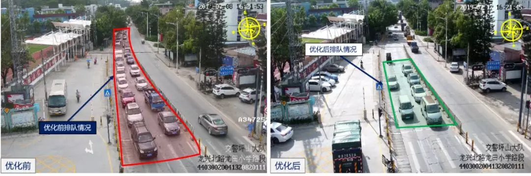 坪山龍興北/龍?zhí)镄W(xué)路口取消行人專用相位后,晚高峰南方向車輛排隊(duì)長(zhǎng)度由160米下降至30米,降幅81%,路口車輛排隊(duì)問題明顯緩解。