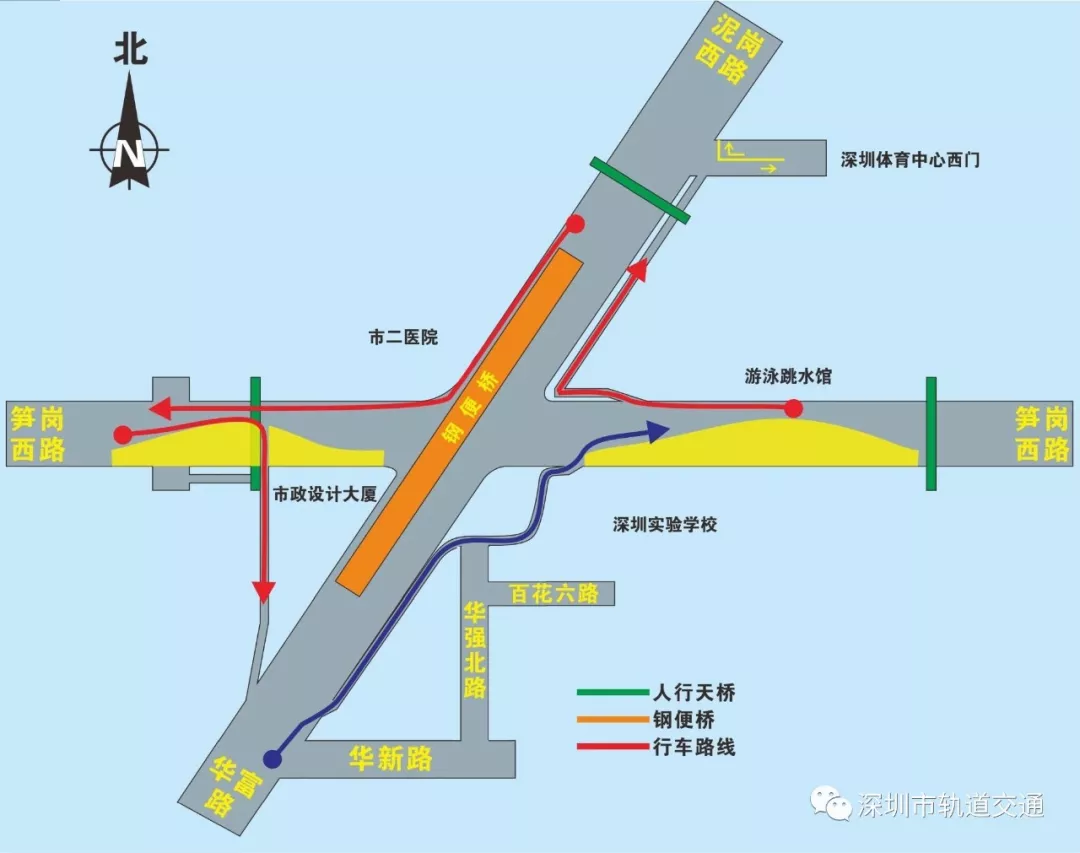 黃木崗路口南轉(zhuǎn)東向(華富路轉(zhuǎn)筍崗西路)、東轉(zhuǎn)北向(筍崗西路轉(zhuǎn)泥崗西路)不在通過平交路口,改為通過輔道進(jìn)行右轉(zhuǎn)。(詳見圖4)