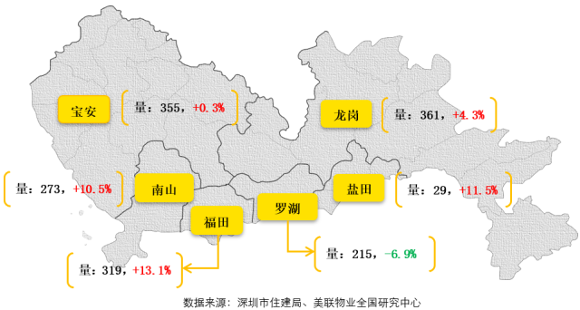 福田、南山、鹽田三個區(qū)成交套數(shù)環(huán)比均出現(xiàn)超過1成的增長;而但從成交套數(shù)來看,羅湖區(qū)的成交量在全市中僅高于一直較低的鹽田區(qū)。