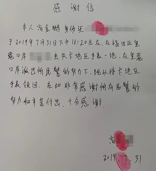7月31日,皇崗口岸派出所接到事主高先生報(bào)警稱,其17時(shí)許在皇崗口岸某處遺失一塊手表(購(gòu)置價(jià)4萬(wàn)余元)。巡段民警周剛迅速出警,將事主帶回派出所詢問(wèn)情況,民警周元華通過(guò)大數(shù)據(jù)分析研判,發(fā)現(xiàn)遺失手表被一男子拾到,且該男子一直在原地等待失主并未離開(kāi)。隨后,周元華將男子帶回派出所歸還失物,高先生向拾金不昧的好心人表示感謝,并給民警們寫(xiě)下感謝信。