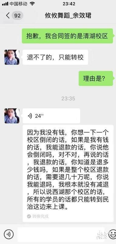 目前,學(xué)員們無法與余效珺保持穩(wěn)定聯(lián)系,但是8月7日與學(xué)員的溝通中,余效珺承認(rèn)清湖校區(qū)需退的學(xué)費約有幾十萬,他無力退還,只能建議學(xué)員轉(zhuǎn)到民治校區(qū)上課。