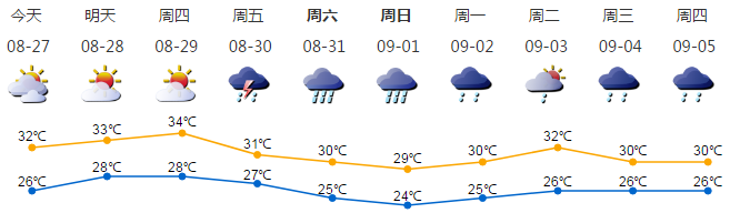 我市多云,局地有短時(shí)陣雨;氣溫26-32℃;偏南風(fēng)2-3級(jí);相對(duì)濕度65%-95%。