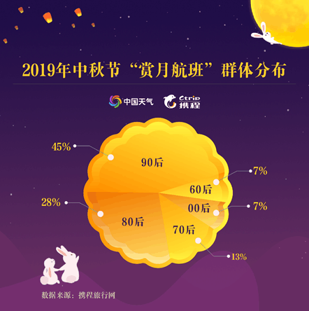 不僅如此,年齡結(jié)構(gòu)上,90后是空中追月人數(shù)最多的群體,占比為45%;其次是80后,占比達28%;70后和00后分列第三、第四位,占比分別為13%、7%。中秋當晚(9月13日)、出發(fā)時間在18時至24時之間的航班通常被稱作“賞月航班”,機上乘客在飛行途中能近距離“接觸月亮”,感受“彩云追月”的新奇體驗。