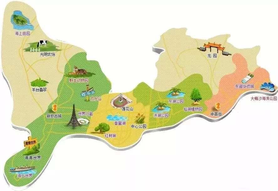 大小梅沙、大鵬片區(qū)、東部華僑城、寶安鳳凰山、仙湖植物園、紅樹(shù)林、世界之窗、蓮花山、東湖公園、福田農(nóng)批市場(chǎng)