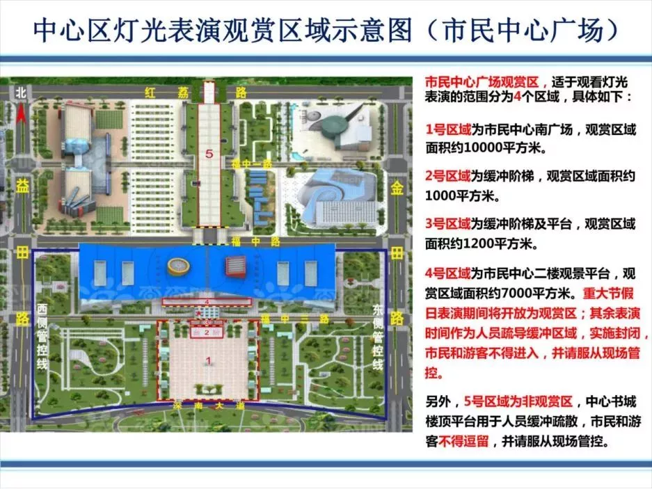 根據(jù)安排,除了福田中心區(qū),南山和寶安區(qū)國慶節(jié)前后燈光表演播放時(shí)間從2019年9月20日開始至10月15日每天晚上舉行三場(chǎng)燈光表演。