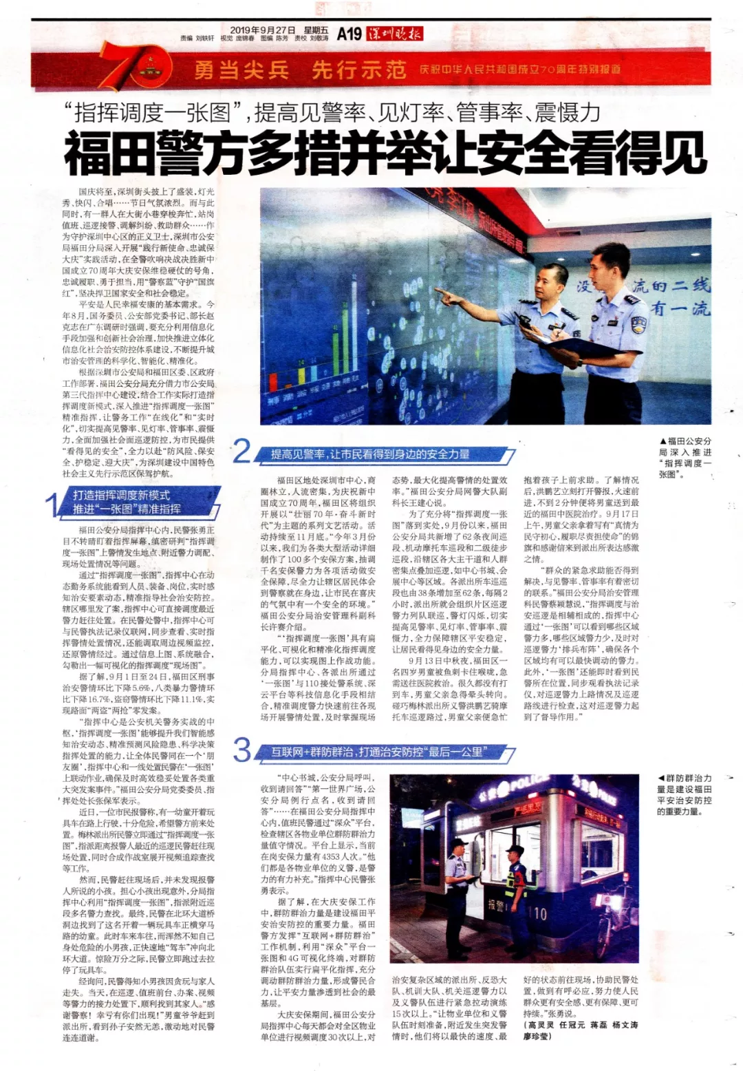 根據(jù)深圳市公安局和福田區(qū)委、區(qū)政府工作部署,福田公安分局充分借力市公安局第三代指揮中心建設(shè),結(jié)合工作實際打造指揮調(diào)度新模式,深入推進“指揮調(diào)度一張圖”精準(zhǔn)指揮,讓警務(wù)工作“在線化”和“實時化”,切實提高見警率、見燈率、管事率、震懾力,全面加強社會面巡邏防控,為市民提供“看得見的安全”,全力以赴“防風(fēng)險、保安全、護穩(wěn)定、迎大慶”,為深圳建設(shè)中國特色社會主義先行示范區(qū)保駕護航。