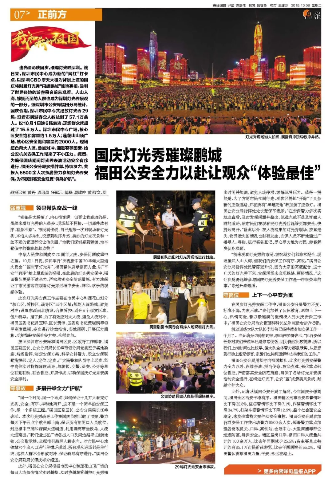 在國慶燈光秀安保工作中,福田公安分局警力不變,標準不降,力度不減。“我們加強了隊伍教育,思想上下一心,熱情高漲,誓以最飽滿的激情投入到大慶安保工作中?!案L锕卜志种伟补芾砜瓶崎L左樂自豪地告訴記者。