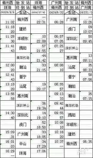 其中,梅州往返廣州12趟,往返深圳10趟,往返潮汕站8趟,往返汕頭8趟,往返珠海、廈門、宜昌各2趟。