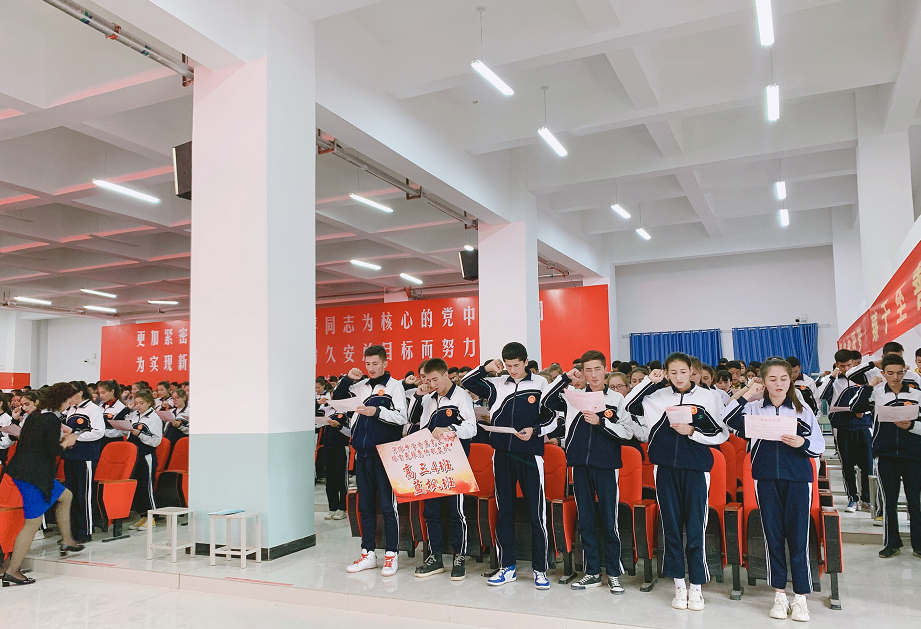 會(huì)場(chǎng)上,紅旗飄揚(yáng),氣氛熱烈。出征儀式在雄壯的國(guó)歌聲中拉開(kāi)了序幕。佩戴著訂制的儀式徽章的高三各連將士整齊站立,高聲宣誓,他們用響徹云霄的錚錚誓言表達(dá)了自己堅(jiān)定奮進(jìn)的決心,用泰然自若的神情展現(xiàn)了深塔學(xué)子氣壯山河的豪氣。誓言震耳欲聾,將士信心滿懷。