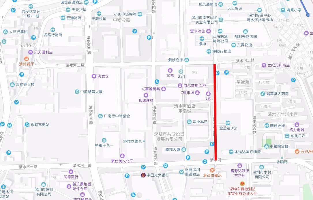 因地鐵14號(hào)線(xiàn)清水河站工程施工需要,2019年10月29日至2020年4月26日共180天,封閉清水河五路(清水河一路至清水河二路段)進(jìn)行施工。原經(jīng)此路段通行的車(chē)輛,可改沿清水河四路或周邊其它道路通行。2019年10月29日至2020年4月26日共180天,清水河五路(清水河二路至環(huán)倉(cāng)路段)由南北雙向通行調(diào)整為由南向北單向通行。2019年10月29日至2020年4月26日共180天,清水河二路(深圳物流集團(tuán)有限公司內(nèi)部通道至清水河五路段)由東西雙向通行調(diào)整為由西向東單向通行。2019年10月29日至2020年4月26日共180天,環(huán)倉(cāng)路(清水河五路至深圳物流集團(tuán)有限公司內(nèi)部通道段)由東西雙向通行調(diào)整為由東向西單向通行。
