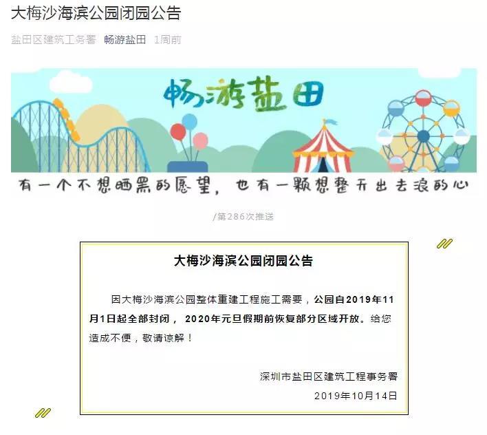另外,大梅沙海濱公園管理處2019年10月12日發(fā)布公告稱:因大梅沙海濱公園重建需要,公園配套停車場封閉施工,暫停車輛停放。