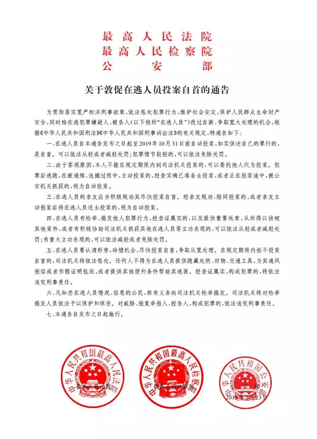 在逃犯罪嫌疑人、被告人(以下統(tǒng)稱“在逃人員”)注意啦!最高法、最高檢、公安部一起喊你們回來投案自首!
