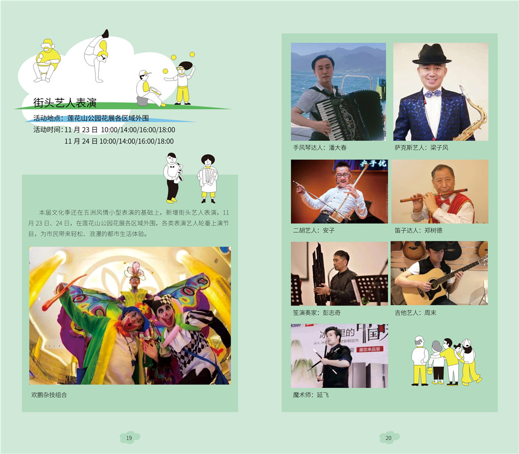 引人關注的是,本屆公園文化季首次引進街頭藝人表演,11月23日、24日,在蓮花山公園花展現(xiàn)場,吉他、薩克斯、笛子、笙、揚琴、中阮、二胡、雜技、魔術等各類表演藝人輪番上演節(jié)目,為市民帶來輕松、浪漫的都市生活體驗。