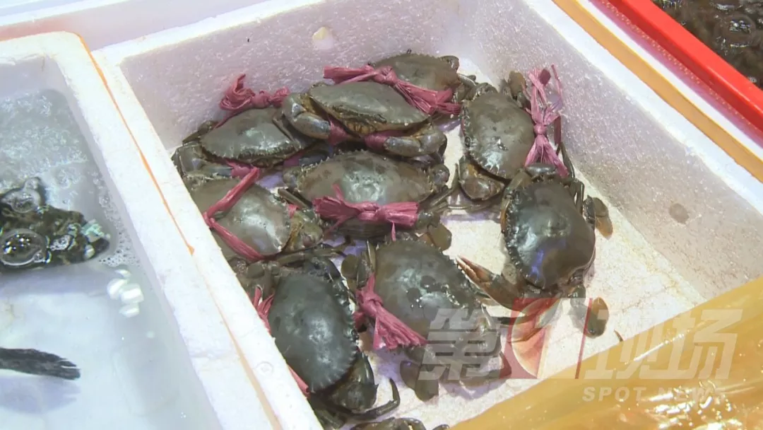 ▲羅芳水產(chǎn)批發(fā)市場內(nèi),膏蟹用白色塑料繩來捆綁。