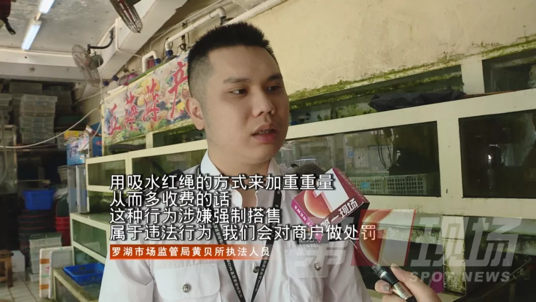 羅芳水產(chǎn)批發(fā)市場商家承認(rèn),的確有一些進(jìn)貨商為了盈利,會要求他們幫忙把紅繩綁上去,或者自己將紅繩加上去的情況,那這一行為是否合規(guī)?記者聯(lián)系了轄區(qū)市場監(jiān)督管理局的執(zhí)法人員到現(xiàn)場。