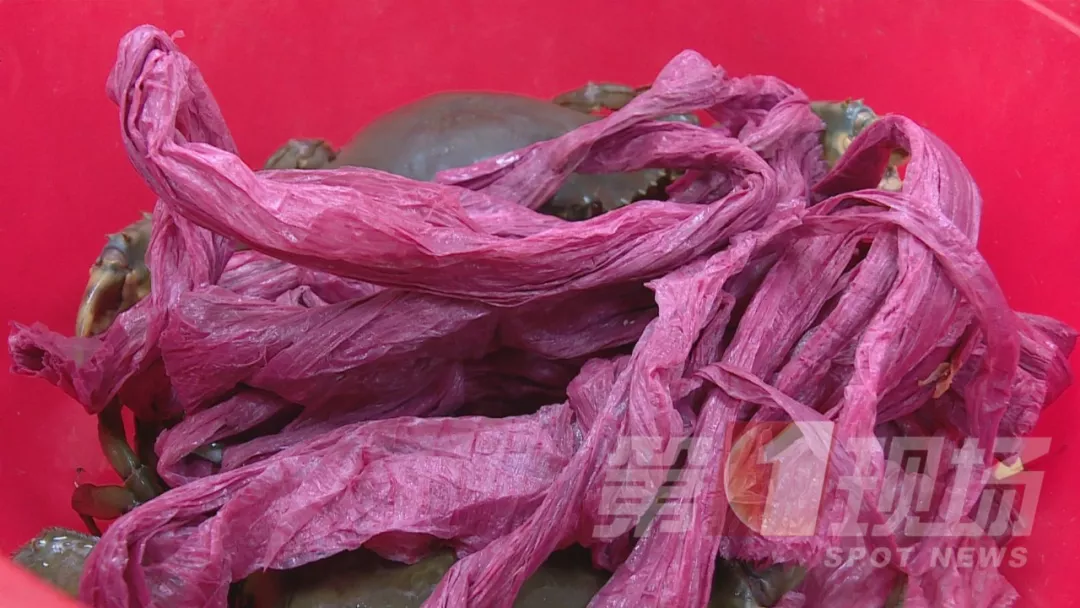 記者走訪另一家店鋪,同樣沒有發(fā)現(xiàn)綁粗紅繩的膏蟹。店家表示,水產(chǎn)市場里賣的膏蟹,是一筐筐從臺州運(yùn)來直接批發(fā)售賣,運(yùn)來時綁的都是白色塑料繩。