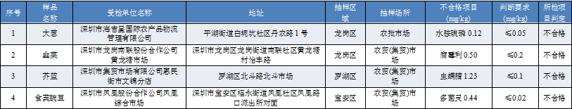 見(jiàn)圳客戶端·深圳新聞網(wǎng)2019年11月12日訊 11月11日,深圳市市場(chǎng)監(jiān)督管理局發(fā)布9月16日-9月20日深圳市農(nóng)產(chǎn)品質(zhì)量安全豬肉和蔬菜例行監(jiān)測(cè)結(jié)果。2019年9月16日-9月20日,深圳市市場(chǎng)監(jiān)督管理局在全市監(jiān)測(cè)豬肉產(chǎn)品53份,抽檢結(jié)果顯示全部樣品合格。抽檢蔬菜共124份,4份抽樣樣品不合格,都為農(nóng)藥檢測(cè)超標(biāo)。其中,深圳市海吉星國(guó)際農(nóng)產(chǎn)品物流管理有限公司銷售的大蔥水胺硫磷超標(biāo),深圳市龍崗南聯(lián)股份合作公司黃龍?zhí)潦袌?chǎng)銷售的韭菜腐霉利超標(biāo),深圳市集貿(mào)市場(chǎng)有限公司惠民街市文錦分店銷售的芥藍(lán)蟲螨腈超標(biāo),深圳市鳳凰股份合作公司鳳凰綜合市場(chǎng)銷售的食莢豌豆多菌靈超標(biāo)。