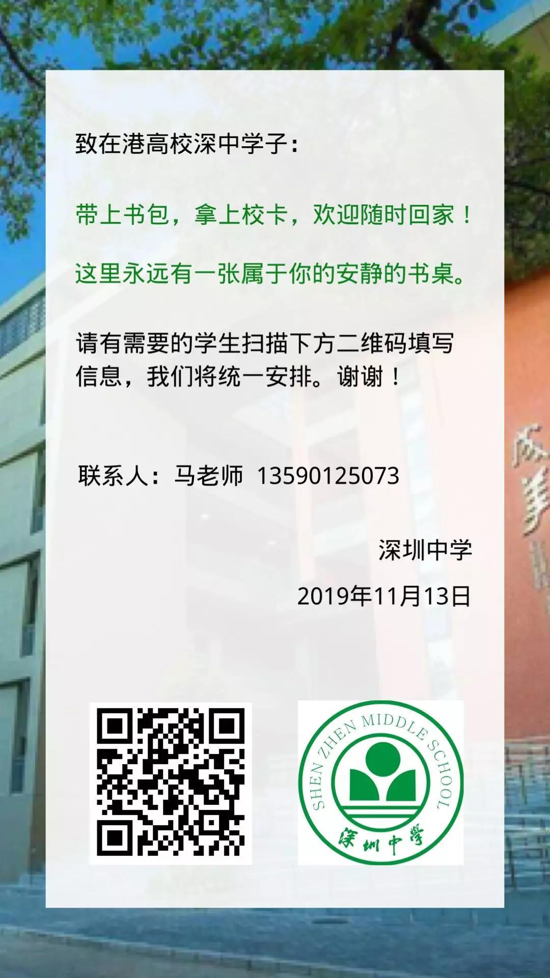 見圳客戶端·深圳新聞網(wǎng)2019年11月14日訊 繼香港中文大學(xué)(深圳)發(fā)文表示為內(nèi)地在港就讀學(xué)生提供臨時(shí)免費(fèi)住宿后,深圳中學(xué)今天也在官方微信公號(hào)中致信在港高校深中學(xué)子,只要拿上校園卡,深中隨時(shí)歡迎學(xué)子們回家!學(xué)校將對(duì)有需要的學(xué)生統(tǒng)一進(jìn)行安排。