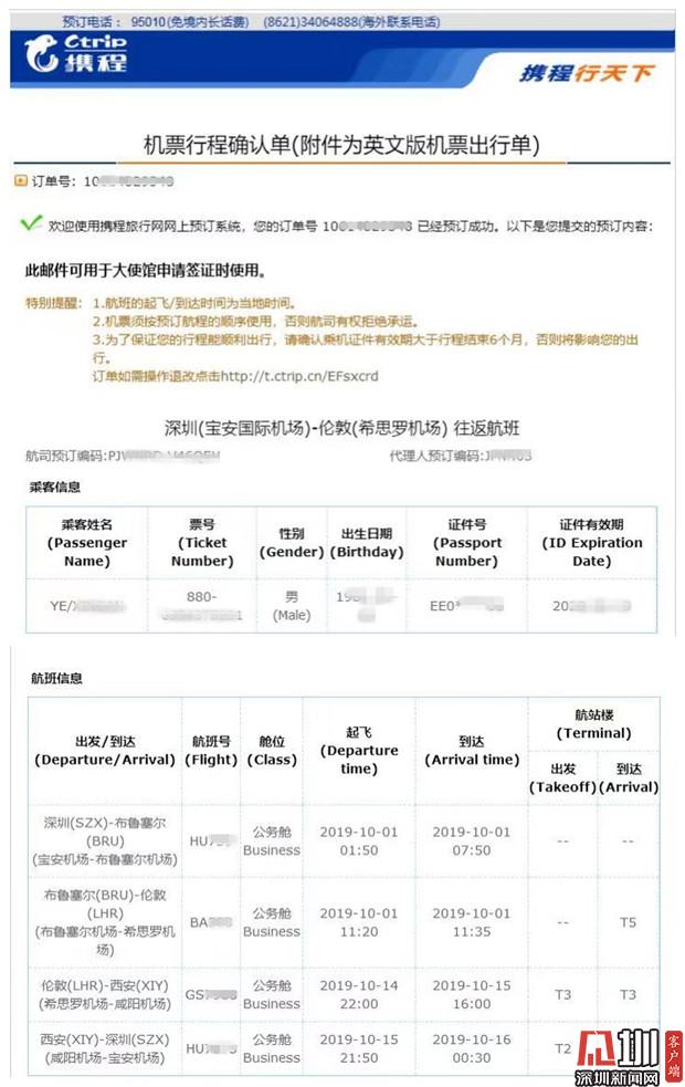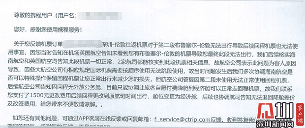 近日,葉先生向深圳新聞網(wǎng)記者爆料稱,他于今年8月份通過攜程網(wǎng)購買國慶期間深圳往返倫敦的機票,但轉(zhuǎn)機時卻因查不到登機信息導(dǎo)致滯留機場,又因航司規(guī)定被剝奪返程機票的使用權(quán)。事后,葉先生反復(fù)與平臺及航司溝通要求說明事件原因并要求賠償,但目前事件尚未完全解決。