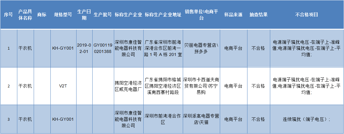 晶報(bào)2019年11月20日訊 近日,江蘇省市場(chǎng)監(jiān)管局對(duì)衣物干燥機(jī)產(chǎn)品質(zhì)量進(jìn)行了監(jiān)督抽查,共抽查50批次。抽查結(jié)果顯示,合格30批次,不合格20批次。其中,深圳有3批次不合格。分別是深圳市康佳智能電器科技有限公司生產(chǎn)的2批次干衣機(jī),及揭陽(yáng)空港經(jīng)濟(jì)區(qū)威克電器廠生產(chǎn)的在深圳市卡西道夫商貿(mào)有限公司、蘇寧易購(gòu)等電商平臺(tái)銷售的干衣機(jī)。