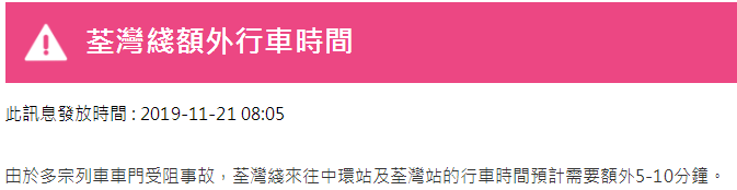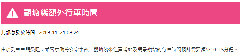此外,目前,由于列車車門受阻,乘客求助等多宗事故,港島線來(lái)往堅(jiān)尼地城站及柴灣站、荃灣線來(lái)往中環(huán)站及荃灣站、觀塘線來(lái)往黃埔站及調(diào)景嶺站,行車時(shí)間預(yù)計(jì)需要額外10至15分鐘。