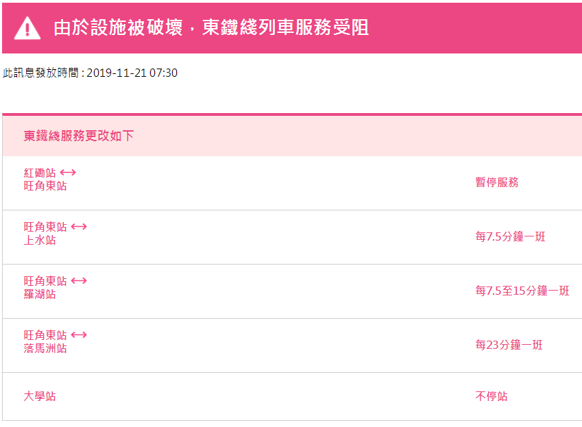 今日,東鐵線提供羅湖站、落馬洲站服務(wù),但行車時(shí)間較長(zhǎng),旺角東站至羅湖站每7.5至15分鐘一班,旺角東站至落馬洲每23分鐘一班,紅磡站至旺角東站暫停服務(wù)。西鐵線紅磡站至尖角東站暫停服務(wù)。