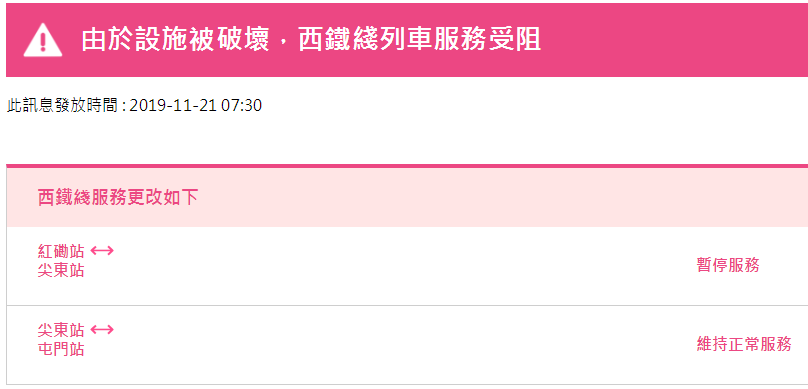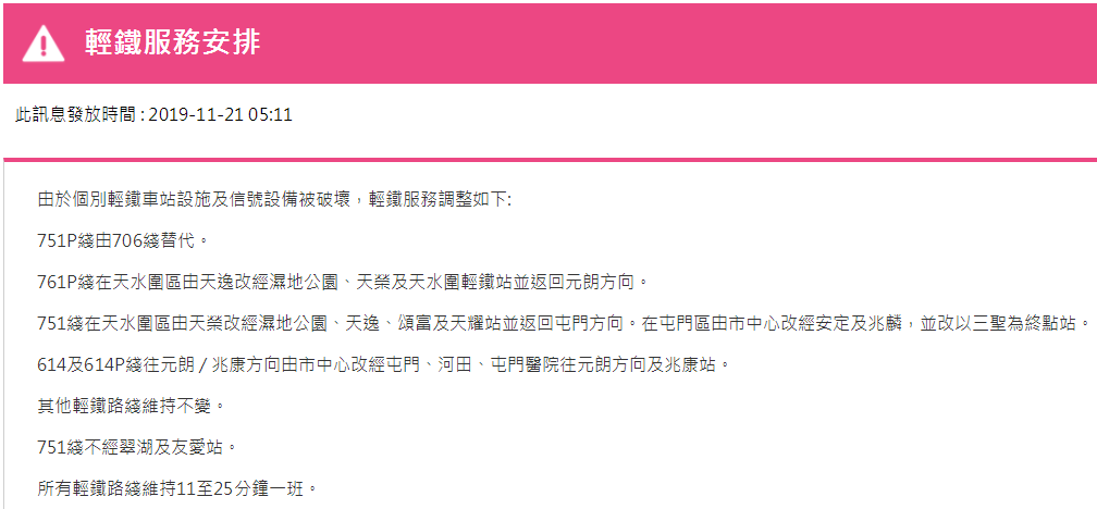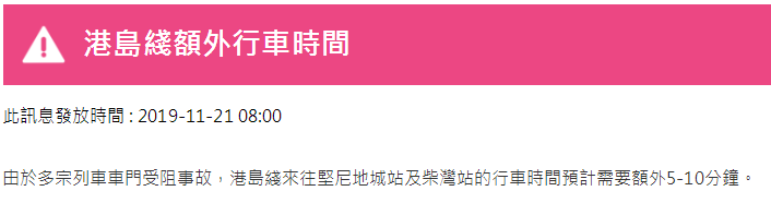 據(jù)港鐵消息,11月21日,香港地鐵各線(機(jī)場(chǎng)快線除外)、輕鐵及港鐵巴士的服務(wù)將于晚上11時(shí)結(jié)束。西鐵線/東鐵線紅磡站及大學(xué)站繼續(xù)關(guān)閉。需要注意的是,元朗站將于下午2時(shí)關(guān)閉,列車不停元朗站,此外,個(gè)別車站出入口會(huì)暫時(shí)關(guān)閉。