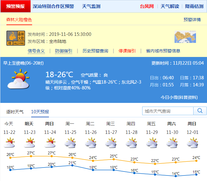 見圳客戶端·深圳新聞網2019年11月22日訊 深圳市氣象局預計22日晴天干燥,早晚清涼,氣溫18-26℃;23-24日多云間晴天,部分時間有輕霧或霾;25日夜間至26日冷空氣影響,北風加大,氣溫略降;展望27日夜間冷空氣繼續(xù)補充,氣溫持續(xù)下降。